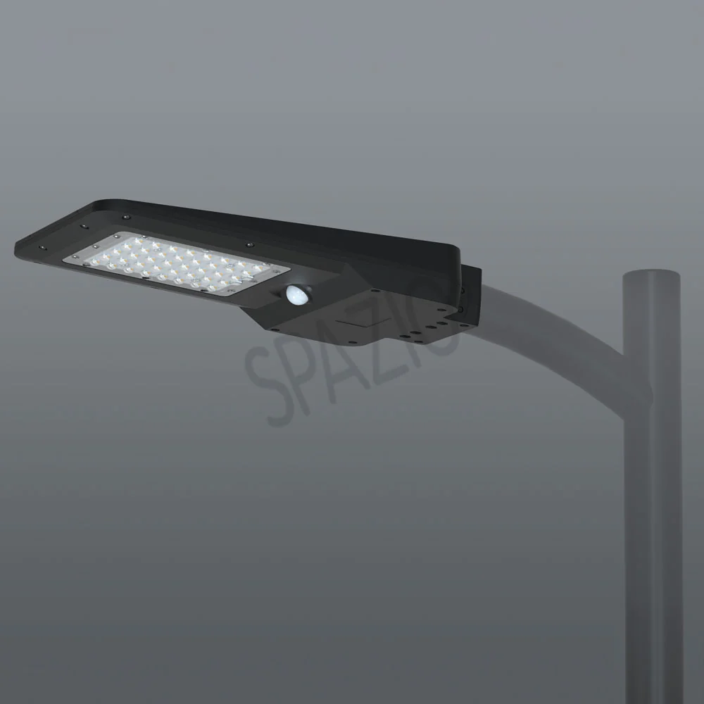 Solar Powered street light with UV protected and fire-proof ABS and Polycarbonate body and polycarbonate diffuser. Includes brackets for wall, straight pole or cusrved pole installations. 120° / 3 - 8 meter detection range.